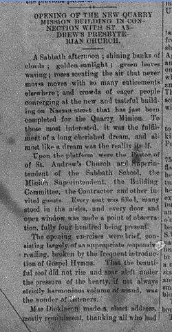 This school laid the foundations for the Quarry Mission School, which was founded in 1881 by Miss Emily Dickenson of Fairport, New York, in connection with St. Andrew's Kirk. A report of the opening of the Quarry Mission School on 8 January 1893 was published in the Nassau Guardian.