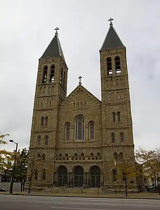 It features a German Baroque Romanesque style. St. Bernard Church was added to the National Register of Historic Places in 1989. The church was designed by noted Akron-born architect William P. Ginther, whose legacy of prominent Catholic church buildings is particularly robust in his native Ohio and neighboring states. The church features symmetrical massing, monochromatic stone, and round semi-circular arches.[2] The building also features recessed windows and rock-faced exterior walls, which is consistent with Richardsonian Romanesque style.[2]