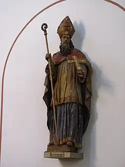 St. Bernward's Church houses several sightworthy pieces of art. The Gothic retable showing various saints and the Coronation of the Virgin dates from 1430.[5] It originally stood in Trinitatishospital, a hospital which was founded in 1230 and destroyed in 1945. There is also a remarkable statue representing Saint Bernward holding a Bernward Cross in his hand. The golden Bernward Cross which was made about 1130 is one of the most famous items in the museum of the Cathedral of Hildesheim.