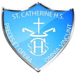 The school's crest is a shield with sky blue fill which represents truth and loyalty. Within the shield is the school's abbreviation above which is a banner and a Latin cross which symbolises faith.[4] The periphery of the shield carries the school's name and motto.