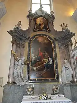 Between 1728 and 1736 the church was enlarged by Christian Obergruber, a master builder originally from Carinthia. A Baroque nave was added to the older part that was retained as the chancel. The main pieces of furnishings, including the pulpit and the altarpiece, were constructed in the 1740s. A crypt was built under the whole nave in 1749.[8] The slow pace of the construction shows that the financial resources of the parish were limited, although several citizens had left donations for the church.