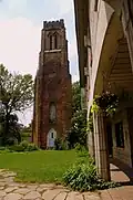 The church was destroyed by fire on February 13, 1955. Only the tower remains. The cost of a new church was deemed too expensive, thus, the congregation worshipped in the rectory until, in 1957, when the parish hall had been converted into a new place of worship.[3] The footprint of the former church is now a garden. In 1985, a two-story cloister was built encircling the former nave.[7]