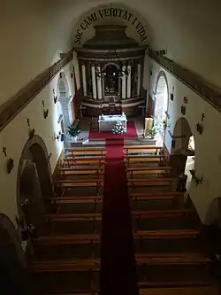 The church is a single-nave church covered with a barrel vault, which opens with three side chapels through a half-point arch. Two small domes rise on each side of the transept. The main apse is polygonal. In the re-decoration there is a remarkable and innovative element for the churches of this period. There is a double tribune, one that communicates with the Montclar Castle, and another lower one corresponding to the church itself. The entrance to the church is at the foot of the west wall, through a large staircase and a semi-circular arch made of bricks. The bell tower is quadrangular and subdivided into three floors. On the first floor there are half-point openings that house the bells and on the top floor there is a clock on each face of the tower. It is made of perfectly cut regular ashlars and is crowned with a pyramidal roof.[1]