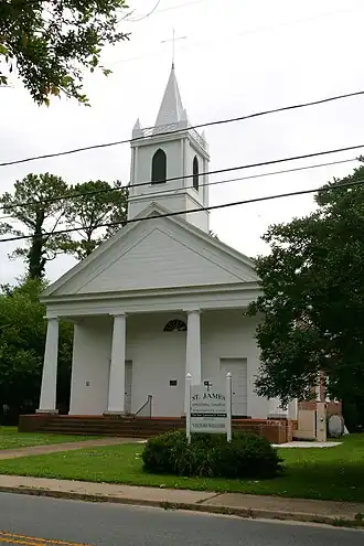 St. James Church is a historic Episcopal Church on Drummondtown Road near Back Street in Accomac, Virginia, United States. Originally established as a chapel of ease for Accomack Parish in the seventeenth century, the present St. James Church was erected in 1838 as the town then known as Drummondtown grew as the county seat (and renamed Accomac in 1892). In recognition of its Greek Revival design and interior trompe-l'oeil frescos, St. James Church was listed on the National Register of Historic Places in 1969. It is also a contributing building of the Accomac Historic District which was created in 1992.