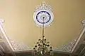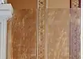 Inside, St. James Church is dominated by Potts' trompe-l'oeil frescoes, which cover all four walls beginning at the dado and rising to and covering the barrel vaulted ceiling. The walls are painted to simulate recessed panels which rise to a painted cornice. Potts then painted a row of coffers around the four sides of the ceiling which frame a large panel that is decorated with simulated plaster scrollwork. In the center of the ceiling is a painted medallion with a profusion of scrollwork. Apart from the ceiling, Potts lavished much detail on the wall behind the chancel, where four fluted pilasters rise to support an entablature and cornice, creating a visual opening to a barrel vaulted apse with coffered ceiling, all painted onto the flat wall. The frescoes conceal a door which opens into the vestry that is centered on the rear wall of the church. In the 20th century, Linda Croison and Philip Ward restored the frescoes, but preserved patches of Potts' original work in the back of the nave.