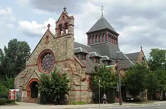 St. James's Episcopal Church is an historic Episcopal church at 1991 Massachusetts Avenue in Cambridge, Massachusetts. The parish was founded in 1864 as a mission from Christ Church. The Richardsonian Romanesque building was built in 1888–89 to a design by Henry M. Congdon. The church was built on the site of the Davenport Tavern, a landmark that had stood on that site since c. 1757 (a portion of which was relocated to Somerville, where it still stands).[2]