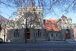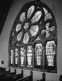 In 1891, the original building was razed to make room for a larger facility, which was completed in 1892. The architect for the current building was J.W. Yost of Columbus, Ohio. The stone church is built in a Latin cross form, but the nave, transepts, and apse are minimal in size compared to the crossing, resulting in a large central space. The architectural style is Richardsonian Romanesque. Features include a slate roof, turrets, buttresses, and rose windows.[2]