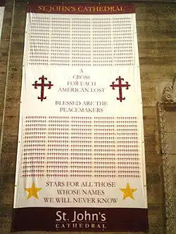 In 1970, Carter drew media attention when he closed the large ceremonial front doors of the church as a protest against the Vietnam War. He noted that the doors were closed "as a sign of our penitence and sorrow, as well as protest. Penitence for our silence and hence our part in the bloodshed. ... Protest that once again our beloved country has chosen guns and bombs instead of other means of reconciliation."[15] The doors remained closed for three years until the war ended. ![]() At the April 1973 ceremony at which the doors were reopened, Carter noted, "This is no moment of triumph. We reopen our doors as an affirmation, to a peace ... which will offer mankind a new life on this planet."[15] The ceremony was interspersed with the sounding of a shofar, the ram's horn traditionally used in Jewish services. Though he considered the peace to be no more than an "armistice" enforced by the "terror of nuclear warheads," Carter said that the church "chose this moment to signify our thanksgiving that our bombers no longer rake the ravaged land, that our prisoners of war are finally home and our fighting forces withdrawn (from) an enterprise which drained the spiritual as well as the material resources of our land."[15] In recent years, the St. John's community actively voiced its opposition to the War in Iraq and other interventions in the Middle East. Each Sunday, the names of each American military person who died in the war were read at the church's services. A banner at the back of the church had a cross marked for each American death in the war. And during the procession of the palms during Palm Sunday services, members of the congregation carried anti-war protest signs along with their palms. |