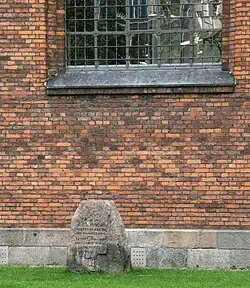 Jens Christian Rudolf Frimodt, the first pastor at the church, is buried outside the church. The headstone features a bronze relief portrait of him by August Saabye. His wife is also buried at the site. Axel Frederik Laurits Rindom (1838–1919), a later pastor at the church, is also commemorated by a stone outside the church.