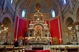 The interior of the church contains five altars. On the main altar there is a painting of St. Josaphat, dressed in the vestments of an eastern rite bishop. The side altars are dedicated to the Virgin Mary and St. Joseph, and in the transept of the church are altars dedicated to Saints Anthony of Padua and Francis of Assisi. The woodwork in the church is crafted of white oak, and there is an extensive collection of murals on the walls.[3]