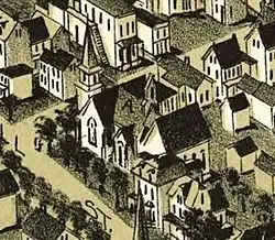 Design of St. Michael's Rectory (1877–78) is attributed to either George Brooke or Furness,[7] and the brownstone residence became another gift of the Brookes. Later alterations — changing the roof, moving the entrance to a 3-story addition (with bathrooms above), adding a bay window where the original entrance had been — are attributed solely to Furness, and probably were done at the same time that the church was expanded.[8] Furness's alterations are visible in an 1890 panoramic view of Birdsboro.[9]