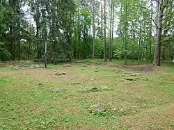 Archaeological excavations at Liikistö during the 1930s, led by Kronqvist, revealed many grave markers and carved stone pavers in the church cemetery. A stone monument that had once been standing was also found in the area, with a shape similar to the Kalevanpoika scythe-stick that stands in the churchyard of St. Peter's Church in the village of Untamala in Laitila.[11] Kronqvist also mentioned the discovery of coins from the 13th and 14th centuries in a 1938 report. A total of 298 graves have been found in the cemetery and radiocarbon analysis of the graves supports the theory that the cemetery was in use from the first half of the 1200s through the 1300s.[12]