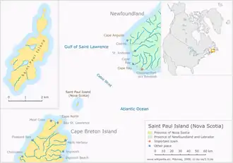 St. Paul Island (French: Île Saint-Paul) is a uninhabited island located approximately 24 km (15 mi) northeast of Cape North on Cape Breton Island and 71 km (44 mi) southwest of Cape Ray on Newfoundland; it is along the boundary between the Gulf of St. Lawrence and the Cabot Strait.