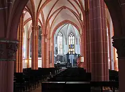 The destruction of the city in 1689 and 1693 left the church a burnt-out ruin with the stump of a tower. The interior was rebuilt in the style of a baroque aisleless transept church.