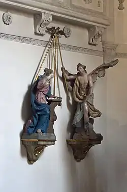 The church features Baroque furnishings including the high altar from 1655, with a main painting by Kaspar Amort: Das Martyrium der heiligen Ursula und ihrer Gefährtinnen, focused on St. Ursula.[1] Sculptures of St. Sylvester and St. Benno, the patron saint of Munich, were created by Matthias Schütz, probably in 1673.[1] A group of sculptures depicting the Annunciation has been attributed to Ignaz Günther or his school.[1][4] This and other works by the same school were acquired in 1770, also a figure of Judas Thaddäus, and busts of St. Benedict and St. Barbara.[1][4] Two statues by Constantin Pader, of St. Nicholas and St. Elisabeth, dated to 1647, were moved to this church in 1898 from the then demolished "Leprosenkirche" St. Nikolaus in Schwabing.[1]