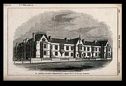 In 1856, it was formally inaugurated as a theological college[3] with 63 students.[1] Its purpose was to train Anglican clergy to serve in the Church of England,[4] in particular in the rapidly expanding cities and towns of Merseyside.[1] New buildings at Shrewsbury Road, Birkenhead, were designed by Henry Cole and inaugurated in November 1856.[5]
