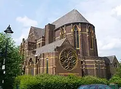 The plans for Brentham Garden Suburb did not include a church and so a site was purchased in December 1905 for a tin church,[2] succeeded by a permanent building designed by Ernest Shearman between 1914 and 1916.[3] A fresco by James Clark was added to the eastern apse between 1917 and 1920.[4] A 1920s organ was replaced by one from St Jude's Church, Southsea in 2011.[5]