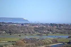 St Catherine's Hill, together with Ramsdown and Blackwater hills, comprise a 3-mile (4.8 km) long ridge running roughly north to south between the Avon and Stour valleys just to the north-west of where the rivers converge in the borough of Christchurch in Dorset.[11][30][31] The top of this ridge is almost a level plateau, 45 metres (148 ft) above sea-level at the southern end and 49 metres (161 ft) in the north. St Catherine's hill, in the south, forms the highest point of this three hill chain at 53 metres (174 ft) and has some of the steepest slopes at 1:1 or 45°.[30][31] The 400 acres (160 ha) site is a mixture of woodland and heath and is part of a larger Site of Special Scientific Interest (SSSI). The eastern slopes and foot of the hill, an area referred to as the Town Common, is almost exclusively open heath and as such has also been designated a Special Protection Area (SPA) and Special Area of Conservation (SAC).[18][31]