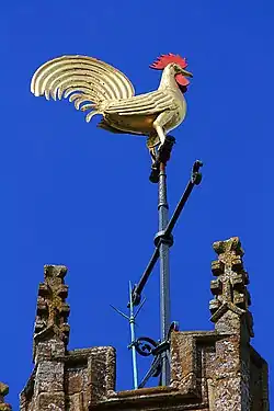 The vestry and north chapel of 1814 are said to be by James Wyatt, however it is more likely to be by Jeffry Wyatt, (later Sir Jeffry Wyattville). The four-stage tower is dated to 1485–95.[2][3] It is supported by full-height offset corner buttresses, and has battlemented parapets with quatrefoil panels below merlons on the corner and intermediate pinnacles. The weathervane was added in 1756 by Thomas Bagley of Bridgwater. There is a hexagonal south-east corner stair turret. Stage 2 has small light on the north side and a statue niche on the south. All the faces on the two upper stages 2-light mullioned, transomed and traceried window under pointed arched labels, with pierced stone baffles. The clockface is under the east window.[4]