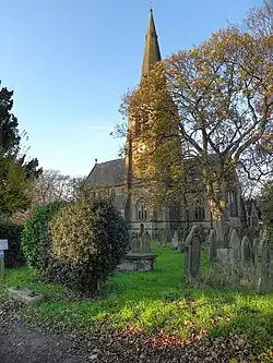 Inside the church is a three-bay arcade carried on octagonal piers. In the chancel are a stone sedilia and piscina.[2] The stained glass in the east and southeast windows is by O'Connor (probably Arthur). At the east end of the north aisle is a window dating from about 1866 by John Adam Heaton. A window in the southwest of the church dating from about 1935 was designed by Edwin Wright, and commemorates the Mothers' Union.[4] The two-manual organ was built in 1972 by Smethurst of Manchester,[5] replacing a three-manual 19th-century organ by Nicholson and Lord that had been rebuilt by Austin Jones of Pendleton in 1925.[6] There is a ring of six bells, all cast in 1887 by John Taylor & Co of Loughborough. There is a further, unused, bell dating from 1835 by Thomas Mears II at the Whitechapel Bell Foundry.[7][8][9]