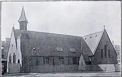 Over the years 1855 and 1856 a simple single aisled bluestone church, consisting of a nave and tower, was constructed on land granted to the Catholic Church in Carlton. This building, known as St George's, Carlton, was to serve a dual purpose as a church on Sundays and a school during weekdays and remained in use as a school for many years. In 1866 a transept was added to the church to cater for the expanding local population and its children. James Hennessy O'Connell was made pastor to the parish in 1881 and began raising funds to expand the complex which later included the erection of a new church, the Church of the Sacred Heart in 1899, new school buildings and a hall.[3]