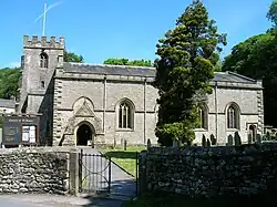 The church is built of stone with a slate roof and consists of a nave, north and south aisles, a south porch, a chancel, and a west tower. The tower has three stages, diagonal buttresses, and a west doorway with a moulded surround, a Tudor arch and a hood mould, above which is a three-light window with a pointed arch. Over this is a small window with a trefoil head, a clock face and bell openings with two lights, and at the top is an embattled parapet with a central gargoyle on each side. Inside, the dado panelling is reused from 17th-century pews, while the current pews date from the 1899 alterations.[1][3]