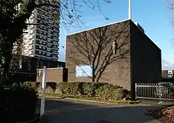 The church building was destroyed on 7 September 1940, the first day of the London Blitz, leaving only the old Infants School Hall.[3] The church used the school hall for worship until the consecration of a replacement on 28 October 1968 by John Tiarks, Bishop of Chelmsford - it had been built to a design by Laurence King and Partners.[4][5] In 1974 St Mark's and St Barnabas' Church, West Silvertown (another former mission church of St Mark's) were declared redundant and their parishes merged with that of St John's (St Barnabas' had been administered by the vicar of St John's since 1945) - this formed the still-existent parish of North Woolwich with Silvertown, which is more or less co-terminous with the Royal Docks ward of Newham.[6][7]