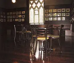 The Great Hall, or dining hall, is a space with a large wooden roof of collar beams and arched braces, with king post and raking queen posts. Each truss is visually supported by short stone shafts with foliate capitals and corbels in the early 14th century manner, as is the tracery. The formal entry stairs intended to be placed to the south have never been built, and the original eastern wall has been replaced by an open arcade. On the western wall of the Great Hall is the Purcell Window, completed in 1930 by Hardman & Co. Birmingham. The upper windows contain the coats of arms of the universities of Sydney, Oxford (trefoils), Cambridge (trefoils), Paris (left soufflet) and St. John's College (right soufflet). The Great Hall has on display a collection of portraits of past visitors, rectors, fellows, and students, with the most significant portrait being Archbishop Polding / Gallery oil painting of Archbishop Polding DSB, 1866, by Eugene Montagu Scott (1835–1909), which was originally commissioned for St Mary's Cathedral.