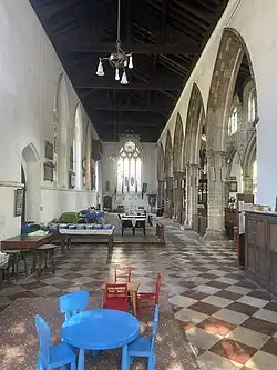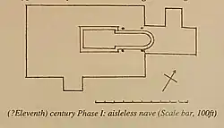The few stones visible beneath the floor at the east end of the nave are part of a longer wall excavated in the early 20th century. They mark out a church similar in form to St Peter-on-the-Wall in Essex or St Laurence's, Bradford on Avon. The remains have been cautiously dated to 1010, just 50 years before the Norman Conquest and over a 100 years after the nave of St Nicholas is thought to have been constructed. This dating is speculative given the marginal remains nor are those foundations certainly the earliest, merely the earliest thus far excavated.[16]