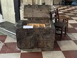 Like most pre-reformation churches in England the life of the laity at St Margaret's was focused on the parish guilds. At St Margaret's, the wealthiest of the two principle guilds was dedicated to the Blessed Virgin Mary and Katherine of Alexandria, like Margaret a virgin martyr and the patron of the nearby St Katherine's Priory perhaps suggesting an Augustinian connection.[9] Founded in 1355 it was probably a replacement to an older guild or guilds which died through reduction of membership during the plague. The purpose of the institution was provision for a good burial and proper chantry commemorations for its dead members, a mutual aid society for its living members, a social club, and a devotional religious society. Initially founded with the modest intention of finding two priests to say mass just twice a year for the souls of its departed members, the Guild of St Katherine soon grew wealthy enough to maintain an altar in the parish church (probably in the north aisle), a large communal guild hall on the east side of Church Gate, and two full time chaplains on a generous stipend of £10. 13s. 4d. per annum (roughly £3,000 today). At the time of the dissolution of guilds it had assets of £20. 10s. 1.5d. (roughly £5,600 today) and made a profit of nearly £7 per annum. When the guild was dissolved the land was divided between Edward Pease and James Wylson and part, at least, of the land to Robert Catlyn.[8] Today a remnant of the Guild of St Katherine is still visible in the church in the form of a large wooden chest bearing the distinctive wheel emblem of Katherine of Alexandria.[9]