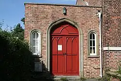 The building is constructed of light red brick, with bracketed eaves, and a Welsh slate roof with stone gable coping. There is a single storey, and along the side are three windows with a roll-moulded surrounds and Tudor arched heads, and a sill band. The porch is to the southwest. Inside the church is Gothick decoration and fittings, a gallery at the west end, and box pews. The plasterwork is particularly rich, and is believed to have originally been painted in bright colours, and to have been created by Italian craftworkers.[1][2][3]