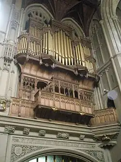 Though Blomfield had designed an ornate organ case, it was not installed until 1901.[8] The organ case and screen is made out of solid oak and is dedicated in memory to the victims of the Boer War. The case and screen have a complex and intricate design, depicting the church building and fabric in various carvings. A Service of Music and Dedication of the Organ Screen was held on 12 October 1901. During the service, Chopin's "Marche Funebre" was played as an act of remembrance to those whose names are inscribed on the organ screen.[12]