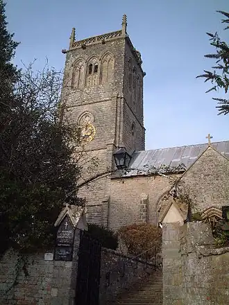 The three-stage tower, which has been dated to around 1397,[3] contains a bell dating from 1777 and made by William Bilbie of the Bilbie family.[4] The church is best known for its unusual carvings on some of its pew ends and in particular the three that make up an allegorical cartoon thought to depict an avaricious Abbot of Glastonbury in the guise of a fox.[5] The pulpit is from the 17th century.[6]