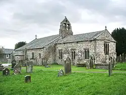 The church is built in blocks of calciferous sandstone and has green slate roofs. The roofs have coped gables and cross finials. Its plan consists of a three bay nave with a south aisle and a south porch, and a three-bay chancel with a north vestry. On the gable between the nave and the chancel is a twin open bellcote. Gargoyles stretch from the eaves of the chancel. The lower courses of the north wall of the nave and a blocked doorway date from the 12th century, and a medieval cross slab is built into this wall. The remainder of the fabric of the nave is from the 13th century. The chancel dates from the 15th century and in its east wall is a Tudor three-light window. The vestry dates from the 20th century. The arcade consists of four rounded-headed arches on round piers. The south wall of the aisle has recesses for a tomb and for an aumbry, and there is an aumbry in the south wall of the chancel. The bowl of the font is Norman, supported on a 20th-century shaft. The stained glass in the west window dates from the 19th century.[2] The single-manual organ was built in 1975 by Eric Mason of Bolton.[4]