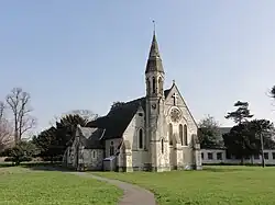 The church building was constructed in 1862 when Whitton separated from St Mary's, Twickenham[4] to become a separate parish. The Gostling family, owners of part of the former estate of the Duke of Argyll, donated land at the junction of Hounslow and Kneller Roads for the new Church and for an adjoining vicarage, since replaced; the architect was F H Pownall.[1] The stained glass windows on the east side of the church are by Clayton and Bell (1862); the window on the west side is by Charles Eamer Kempe (1892).[1] On display in the church is a 15th-century alabaster panel of Christ and Arma Christi, imported from Valle Crucis Abbey, Wales, in 1913.[1]