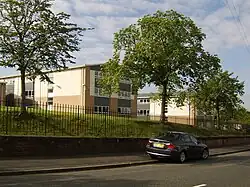 The original school was built in the 1950s, and at the end of the 2001/2002 school year the original building was demolished to make way for a new one. During the rebuilding works staff and pupils were temporarily based at Woodside School, close to the city's Anderston area. The new facility consists of the Abbey Building and the Mitre Building, and was built as part of Glasgow's PPP school building programme. The new building was completed in 2003[2] and the school was officially opened on 3 December 2004 by the then Education convener of Glasgow City Council, Steven Purcell, a former pupil. The new school is one of the largest Roman Catholic schools in the city and has a capacity of over a thousand pupils.