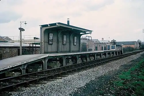 Construction of the line began in 1882, but financial pressures forced the S&WDR to save costs where possible. An existing private house was adapted for Staines West station, which was provided with a single platform.[6] The temporary terminus, and only intermediate station at Colnbrook, was also provided with a single platform and a passing loop was not installed there until 2 May 1904.[11] The line from West Drayton to Colnbrook opened on 9 August 1884 and passenger services began running to Staines on 2 November 1885.[6]