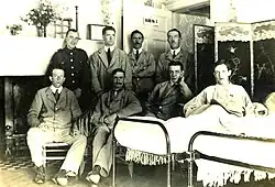 During the War he offered Stapeley House to serve as a hospital. In 1916 about 137 wounded men were transferred here for treatment and to await recovery. They all praised highly the excellent conditions and provisions made for them during their convalescence.[15] A photo of some of the soldiers who were here during the War is shown.