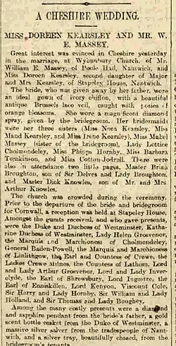 The family moved to Stapeley House in about 1882 when Robert retired from the military forces. He appears to known many people in high society as in 1904 his daughter's reception was held at Stapeley House and the guests included many notable people including General Baden-Powell. The newspaper article about the wedding is shown.