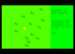 Star Warrior is based on a modified version of the BASIC game engine as previous Apshai-based games. In previous games the playfield was presented as a top-down view of a series of interconnected rooms. Only one room would be displayed at a time, and a new room would be drawn after the player moved through a door. In Star Warrior the action takes place outdoors, the first Epyx game to do so,[1] with the display showing a one-kilometer area from a seven-by-nine kilometer map, redrawn and re-centered when the player reaches the edge of the current displayed area.