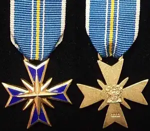 The Star of South Africa, Officer (post-nominal letters OSSA) is the fourth-ranked decoration of five non-military classes of the Order of the Star of South Africa, a South African military order that was instituted by the Republic on 1 July 1975. The Order of the Star of South Africa was discontinued in 2002.[1][2][3]