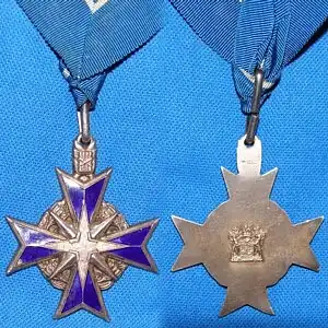 The Star of South Africa, Silver was struck in silver and is a Maltese cross, with the arms in dark blue enamel, with protea flowers between the arms of the cross. Two four-pointed stars, superimposed on one another, are mounted on the cross.[2]