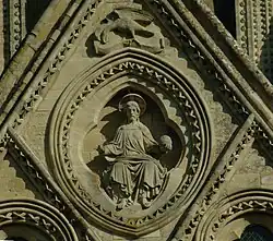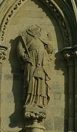The overall scheme is divided into six tiers.[3] The niche numbering system works from left to right (north to south) as viewed from the west, and from top to bottom. The four lower tiers begin on the north face of the north turret and continue around onto the south face of the south turret; only the lower two tiers have statues on the north face.