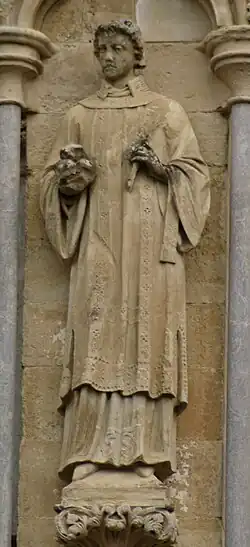 166 Deacon Martyr, ?St Birinus Early 14th century Anon: Head by Redfern On north face, both lower arms missing. Badly weathered.