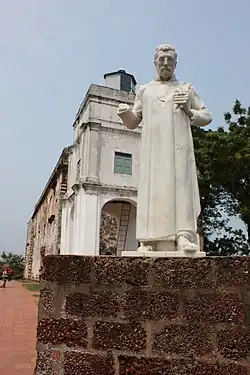A statue of Saint Francis Xavier (1506–1552) stands outside the ruins of St. Paul's Church on St. Paul's Hill, Malacca City, Malaysia.