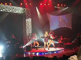 Prior to the release of Stay Alive, two different sample versions of the song "Dance" were released by Universal Records via YouTube.[33][34] After a couple of days, the song received rotation over the radio, but was immediately pulled out due to cancellation of the album release. In October 2011, the song was officially released and started receiving limited airplay through radio stations. It was later revealed that Nina personally picked the song as the album's lead single, accepting the risk of catering a new different sound to listeners.[35] "Dance" is an aggressive uptempo club, house dance song,[23] described as an "upbeat track with a catchy melody."[20] Two versions were shot as official music videos for the song, both directed by Sean Lim. The second version was released on December 9, 2011, and features Nina in Gaga-ish costumes.[36] Knight of R&B Duncan Ramos made an appearance in the video, portraying her love interest in the club-dancing scenes. The song was given very limited commercial promotion, and its video was not played on myx until March 2012—which led Nina's fans to questioning Universal's marketing strategy. On January 30, 2012, Universal posted a sample version of "However Much Love", revealing it as the second single from the album.[37] The song was set for a Valentine release as a radio-only single to boost up album sales. It was both critically and commercially acclaimed, being called a "standout" by Philippine Entertainment Portal and peaking at number one for three consecutive weeks, becoming Nina's first chart-topper since 2008's "I Don't Want to Miss a Thing".[22] "Believe in the Dream" was released on April 24, 2012 as the third single from the album, accompanied by an official lyric video posted by the label on the same day.[38] The song received overwhelming positive reviews by critics, but failed to chart due to loss of promotion.[31]