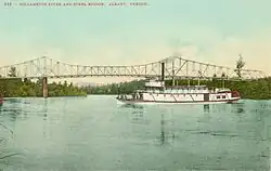 Another sidewheeler on the Willamette River at this time was the Mississippi-style Wallamet, which did not prosper, and was sold to California interests.[6] In 1853, the side-wheeler Belle of Oregon City, an iron-hulled boat built entirely in Oregon, was launched at Oregon City. Belle (as generally known) was notable because everything, including her machinery, was of iron that had been worked in Oregon at a foundry owned by Thomas V. Smith. Belle lasted until 1869, and was a good boat, but was not considered a substitute for the speed and comfort (as the standard was then) of the departed Lot Whitcomb.[6]