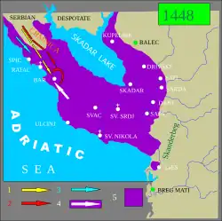 In 1444 Stefan Crnojević found strong new protectors in the Venetian Republic. In Venetian-held Lezhë on 2 March 1444 Stefan and his sons forged an alliance (League of Lezhë) with several noblemen from Albania, including Skanderbeg.[11] With the restoration of the Serbian Despotate after the Crusade, Stefan gave his loyalty to Despot Đurađ Branković in 1448. Together with Branković and Skanderbeg he attacked Venetian held Bar and Ulcinj.[12] Venetians were reluctant to fight against Serbian Despotate and had intention to estrange Branković and Skanderbeg. In July 1448 Jakov Dolfin, the governor of Bar, was victorious in the battle against Altoman's forces whose part was commanded by Stefan.[13]