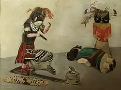 Some of the most colorful paintings came from visits he made to Mexico from 1929 to 1933. A small one, Kachinas shows the same careful handling of tones and balancing of pictorial elements as in his earlier work, but its colors are intense and its treatment realistic. The figures shown are Hopi spirit-figures, one of whom is performing a ritual snake dance.[30] Other subjects from these trips include burros, a bullfight scene, musicians, and an allegorical painting of a priest, soldiers, a man with a bag of money, and three peasants slumbering.[31][32]