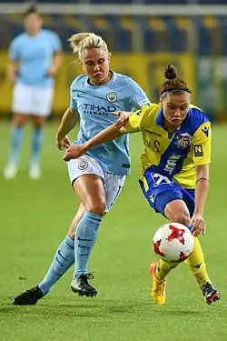 Shortly before the end of the season 2016/17, Enzinger announced her transfer to the reigning Austrian champion in women's football, St. Pölten.[15] On 4 October 2017, she made her debut for St. Pölten in the 3–0 defeat against Manchester City on the first match of the 2017–18 UEFA Women's Champions League's Round of 32.[16][17]